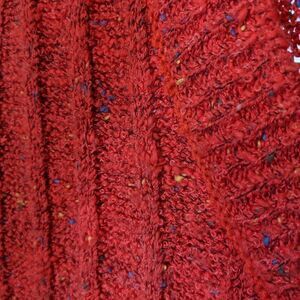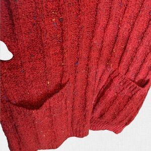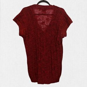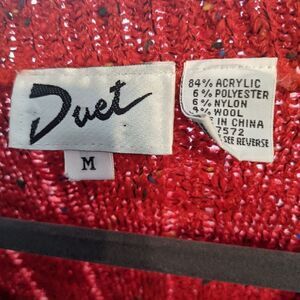 Red, with multicolored spots throughout. Women's Medium. Deep V-Neck. Two large pockets on the front. Short sleeve. Pit to pit 25" 0132