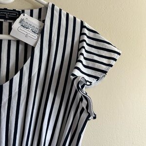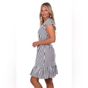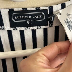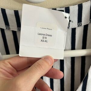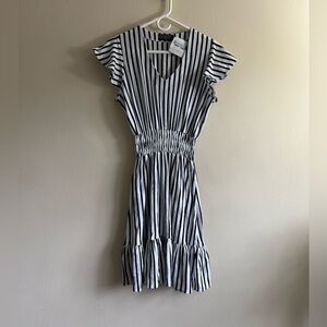 NWOT Leona dress from Duffield Lane in a size Small. This dress has a cinched elastic waist and a beautiful blue and white stripe pattern. Short sleeves. No interior tags. No stains or flaws!