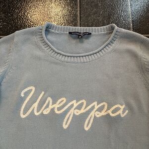 This is an excellent condition Duffield Lane "Useppa" sweater, a beautiful piece perfect for layering or standalone wear. The sweater features a soft, light blue (sometimes called periwinkle or baby blue) 100% cotton knit, making it breathable and comfortable for year-round use. The front is accented with the charming, high-quality embroidered script word "Useppa" in a contrasting white, adding a classic, preppy, or coastal resort style touch. It is a women's size Medium (M), with measurements shown in the photos for accuracy (approx. 18-19 inches pit-to-pit and 23 inches long from shoulder to hem). This sweater has been gently worn and maintained in Excellent Condition with no flaws, stains, or pilling. A great addition to any wardrobe!