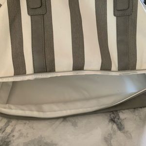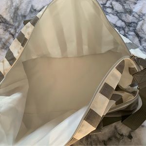 Adorable carry duffle bag. Never used. Top zipper for main compartment. Lower compartment with zipper. Shoulder strap and 2 handles. Perfect for a quick get away or beach day. Great for airplane carry on