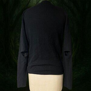 Size S, can fit a M. Features V neckline, thumb holes, and cutouts at the elbows. Super soft! There is a bag of extra yarn attached on the inside. The yarn weight is perfect for Spring and Fall.