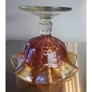 Dugan Marigold Amber & Clear Iridescent Carnival Glass Compote Ruffled Edge
