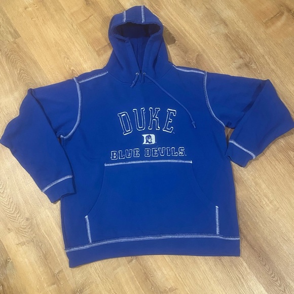 Vintage blue Devils Duke hoodie with front pocket. Features bold lettering on the chest.