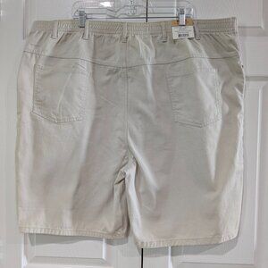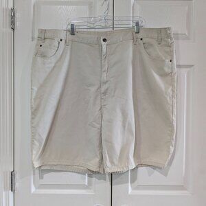 Duke men’s relaxed fit jean shorts in light beige, size 48, big and tall. Made of 100% cotton with a classic 5-pocket design, button zip closure, and elastic on the back of the waist. New with tags. Measurements are approximately 48" waist, 15.5" front rise, 19" rear rise, 9" inseam, and 24.5" overall length.