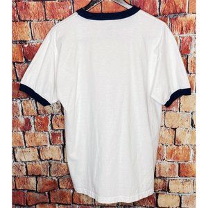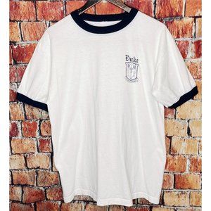 Duke University Blue Devils Men’s White Large Short Sleeve T-Shirt Blue Trim. Pre-owned in great used condition. There is some slight bleeding from the blue trim. Measurements are approximate arm pit to arm pit laying flat 21”; sleeves 8”; shoulders 19”; length 28”.