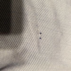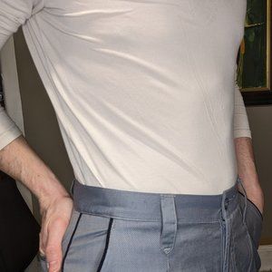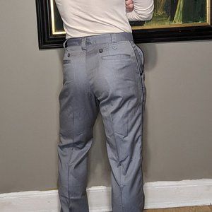 It's a light, blueish-grey dress pant. 100% wool with dark blue pinstripe accent down the side of the leg and around the front of the pockets. There are 2 very small pin-sized holes under the left, back pocket.