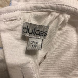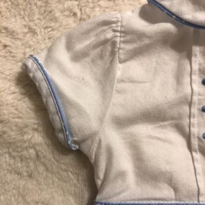 Heirloom-quality Dulces white romper with blue polka dot detail, size 3-6 months. This sweet romper features incredibly special details: Peter Pan collar with blue piping, blue piping around sleeves, pin tuck detail with embroidered blue dots on the front, mother of peal buttons, and pin tuck detail along the back. This is a truly special little piece! Dulces is a Spanish brand sold at El Corte Ingles department store headquartered in Madrid.