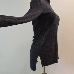 Heavier weight rib knit fabric in a heather charcoal. Mock neckline. Split high-low hem.