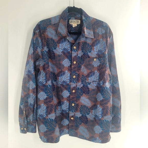 Duluth Men's Blue Cotton Leaves Pattern Button-Up Shirt Long Sleeve Size L