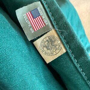 Beautiful heritage canoe pack made in the USA with 15 oz. canvas and leather. Spruce with dark brown leather accents, a color no longer available. Inner zip pocket. Good used condition -- one small hole as seen in photos, would be easy to sew up or patch over. I didn't take this out on many outings, this has lots of life left. Retails for $175.