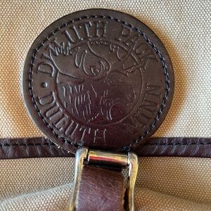 Classic tan canvas messenger bag with brown leather accents. Features a front buckle closure and adjustable strap.