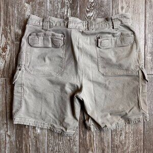 Duluth Trading Cargo Shorts Mens 42 Flex Fire Hose Khaki Flap Pockets Canvas