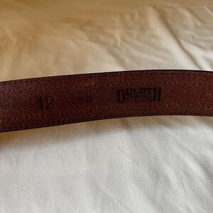 Duluth Trading Co leather belt, brown leather work belt, vintage utility belt, heavy duty brass buckle belt, O-ring detail belt, casual rugged belt, men's size 42 workwear belt, western inspired leather belt, carpenter work belt, durable everyday wear belt, outdoor gear belt, rustic brown leather waist belt, vintage style Duluth belt.