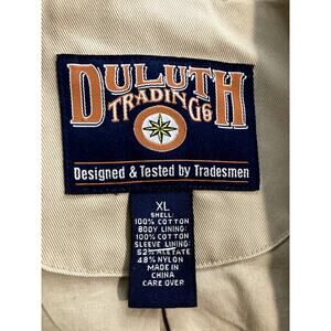 This is a great looking Duluth Trading Co. Canvas Sport Coat in Men's size XL. RUNS BIGGER, Check Measurements. The color is a versatile tan, perfect for a variety of occasions. It features a barn coat style with 2 chore pockets, making it practical for hunting or everyday wear.
