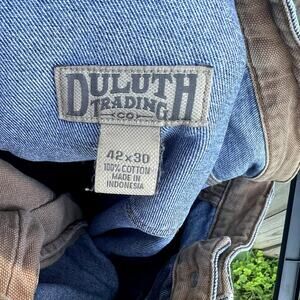 Duluth Trading Co men's carpenter jeans in size 42x30. Built for durability and function, featuring a relaxed fit and utility pockets for work or everyday wear. Classic heavyweight denim.
