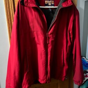 Durable outerwear by Duluth Trading Co. Features a charcoal body with dark red accents. Ideal for rugged use. Very soft and comfortable to wear but also keeps you warm. Adjustable waist and hood. In excellent condition.