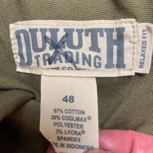 Size: 67% Cotton, 30% Coolmax Green Duluth Trading Co., Coolmax Flex Firehose, cargo shorts, men's shorts, outdoor wear, green shorts, durable shorts, relaxed fit, cotton blend, breathable shorts, multiple pockets, sturdy shorts, Duluth shorts 48
