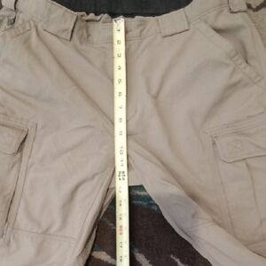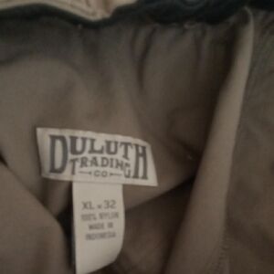 Experience comfort and durability with these tan cargo pants from Duluth Trading Co, featuring a relaxed fit and crafted from a sturdy material ideal for everyday wear....there the fire hose work wear cargo pants. there in good condition..no stains or holes. crouch gusset, fendoff finish n triple dip pockets. measurements are in pictures..there taken flat lay... there in brown color