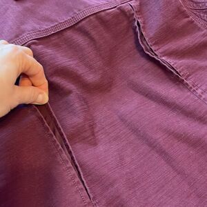 This Duluth Trading Co button down is great for outdoors activities and casual wear - definite Carhartt vibes! Burgundy fabric that's perfect for fall and brass colored metal buttons down front and on pockets. Two stretch cotton vents on back between shoulder blades for comfort and movement. Also stretch cotton under arms - great details on this shirt!
