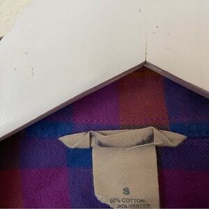 Duluth Trading Co., Duluth flannel, plaid shirt, women’s flannel, small size flannel, cotton blend shirt, purple plaid, rugged outdoorsy shirt, cozy button-up, casual layer, fall fashion, winter flannel, workwear style, utility shirt, durable flannel, soft plaid top, Duluth Trading women’s, long sleeve button-up, camp shirt, checkered, Buffalo check