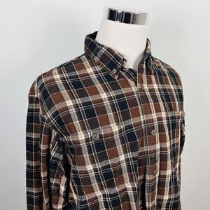 Duluth Trading Co Large Flannel Work Shirt Brown Black Plaid Button Down Cotton