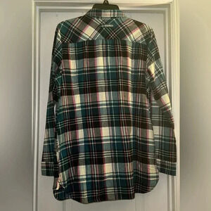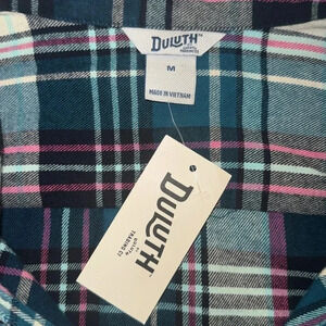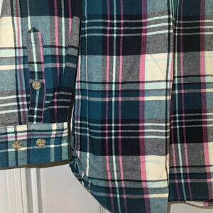Duluth Trading Co. Long Sleeve Flannel Green and Pink Stripped Shirt