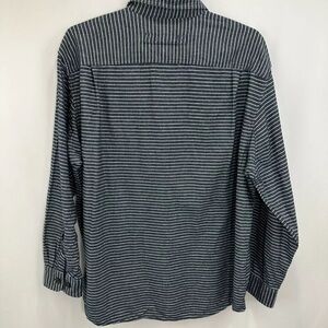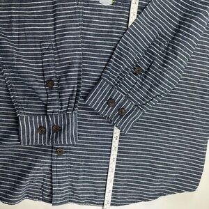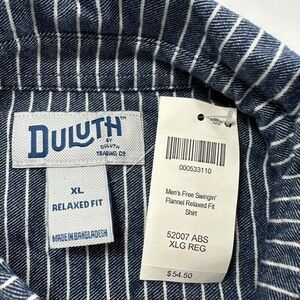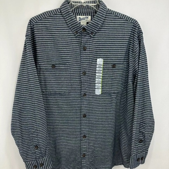This Duluth Trading button-down shirt is perfect for any occasion, whether it's for travel, casual wear, or work. The shirt is made of comfortable cotton flannel and features a relaxed fit, long sleeves, and a collared neckline with a button-down closure. The blue striped pattern adds a touch of style to the shirt, while the accents and pockets provide both functionality and a unique touch.