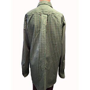Features a long sleeve styled shirt with magnetic button like closure and green, white, and beige plaid color design all around. Actual color is shown on the 3rd picture. Measurements are shoulders 21”, chest 58”, sleeves 26.5”, and length 33.5”. Made of 100% cotton material. Excellent pre-owned condition! This item has been cleaned, sanitized and deodorized.