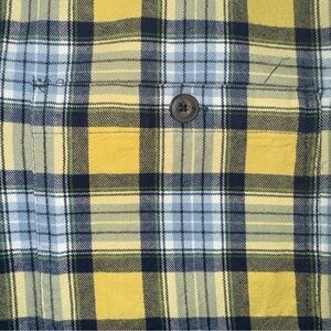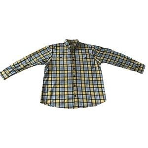 This Duluth Trading Co. Men’s Plaid Flannel Shirt in size Large is perfect for any occasion, whether it’s outdoor work or casual wear. Made with durable, comfortable flannel, this shirt is designed to keep you warm while offering a stylish plaid pattern in yellow, navy, and light blue.