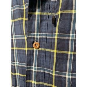 Excellent preowned condition. Zipper pocket on chest. Extra buttons still in tact. Has extra material by armpit for easier movement. 3% spandex gives the shirt some stretch. Colors are dark blue light blue and bright green.