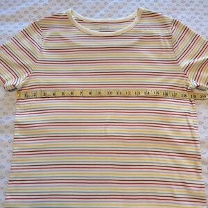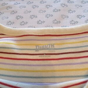 This 100% cotton t-shirt from Duluth Trading Co features a classic cream color with multi color stripes and short sleeves, making it a versatile addition to any wardrobe. It’s flattering silhouette, perfect for casual outings or everyday wear.