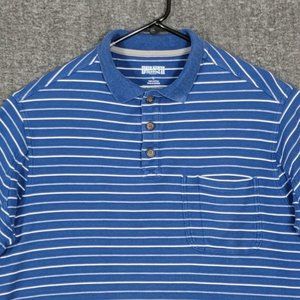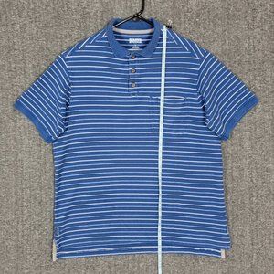 Duluth Trading Co Polo Shirt Mens L Blue Short Sleeve Striped Pocket Side Gusset.