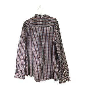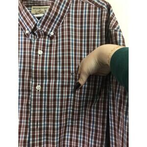 Duluth Trading Co. red and blue wrinkle fighter relaxed fit long-sleeve button down. One front pocket and button closure.