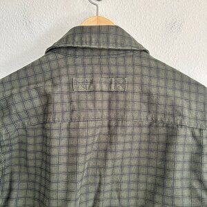 Duluth Trading Co mens size small green plaid insulated shacket with snap front closure.
