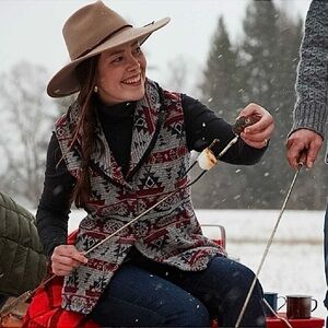 This is a Duluth Trading Company Sherpa Festivest gray black southwestern Aztec design vest. Quilted lining. Button front closure. Great for outdoors. Warm and comfortable. Women’s size M or medium. Bust 20”. Length 24”. Excellent condition.