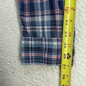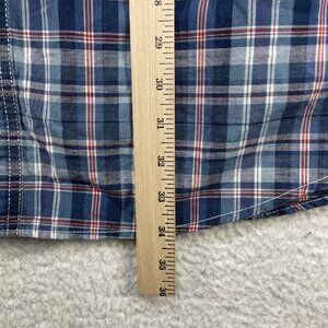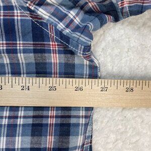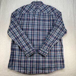 This Duluth Trading Co in blue red and white plaid features long sleeves, a collared neckline with a button-down collar, and flapped pockets. Perfect for any casual occasion, this heavier weight shirt is available in size XLarge Tall. It is very good condition, see the photos for details.