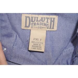 Duluth Trading Co short sleeve button-down shirt in a classic blue chambray tone. Features a button-down collar, front chest pocket, and durable 100% cotton construction. Tall sizing (2XLT) provides extra length for comfort and coverage. Perfect for workwear, casual outfits, or outdoor wear.