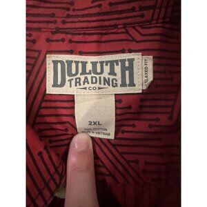 This Duluth Trading Co. button-down shirt features a plaid pattern in red and black, with a relaxed fit and short sleeves. The shirt is made of 100% cotton flannel fabric, with a button-down collar and closure. It also includes button accents, pockets, and is suitable for all seasons. The shirt is available in size 2XL and is perfect for casual occasions.