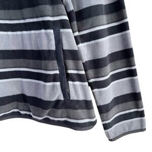 Features: standup collar, 1/4 zip front, zip pocket at chest left, 2 zip pockets at sides, soft and warm fleece material. Color: black and gray horizontal stripes.