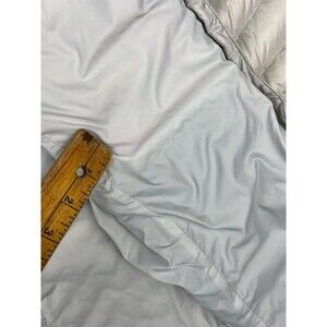 The Duluth Trading Co Women's Down Jacket in size M is a stylish and practical outerwear option for the colder seasons of winter, fall, and spring. Made with a softshell polyester outer shell and lined with soft polyester, this hooded puffer jacket features a zip closure and a classic solid light gray color. The quilted design and logo accents add a touch of style to this functional jacket, suitable for travel, casual outings, or workwear. Machine washable and made with high-quality duck down insulation, this jacket is a warm and reliable choice for everyday wear. See photos for measurements, last picture shows small pinkish blemish on the inside of jacket (not noticeable from outside of jacket).