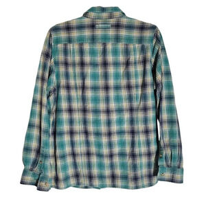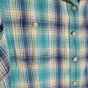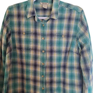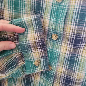 Duluth Trading Co Cotton Flannel Plaid Button Front Shirt. Women's Size Large. Plaid Pattern Colors are Green, Blue and Yellow. Flannel Fabric is 100% Cotton. Good Pre-owned Condition.