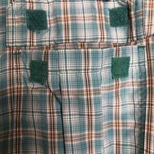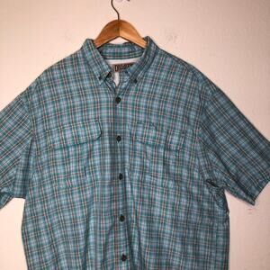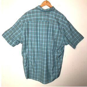 Duluth Trading Company men's short-sleeve button-down shirt with a blue and green plaid pattern. Size: Large