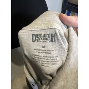 This is a women's long sleeve polo camp shirt from Duluth Trading Company in size medium. It features a collared neckline and is made of a blend of polyester and cotton in a moss green color. The style is basic and suitable for casual wear.