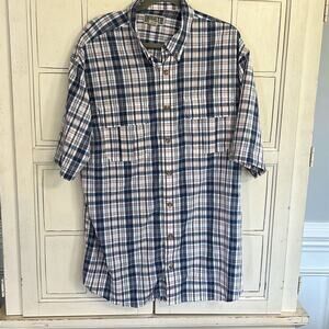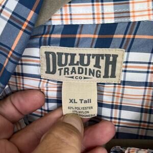 Duluth Trading Company size XLT plaid button down shirt in excellent condition. Polyester and nylon. Measures 27” from armpit to armpit and 34” long. White with blue and orange.