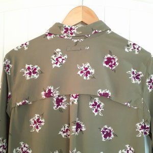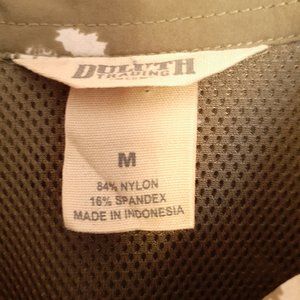 Very good pre-owned condition. Duluth Trading DuluthFlex Sidewinder Long Sleeve Shirt. Size Medium. Color is olive green with white and purple floral print.