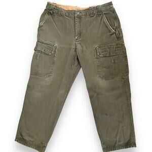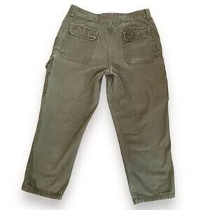 Men’s Duluth Trading Co Olive Green Heavy Duty Fire Hose Canvas Pants with a Relaxed Fit and Cargo Pockets in a Carpenter’s Style.
