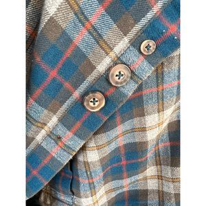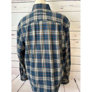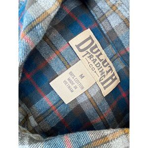 Duluth Trading Co Flannel Shirt Plaid Medium. Long sleeve button front with two front button close pockets. 100% Cotton. Machine washable. Made in vietnam. Extra button included. Aqua blue, gray and red in color. Pit to end of sleeve 20.5", shoulder to end of sleeve 25", pit to pit 23", back bottom of collar to bottom of shirt 33.5". Great preowned condition with no rips or stains.