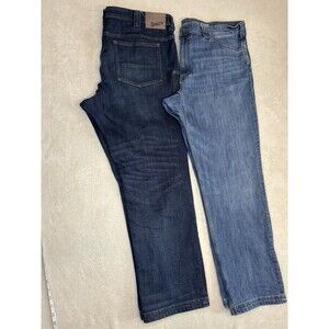 The set of 2 Duluth Trading Ballroom Double Flex Jeans are a durable and comfortable pair of denim jeans designed for men. Made of cotton denim with medium wash and dark wash, these jeans feature a solid blue color and a zip closure for easy wearing. The 42x32 size and 5-pocket design offer both style and functionality, while the mid-rise fit and straight leg silhouette provide a classic look. Perfect for all seasons, these jeans are machine washable and suitable for everyday wear.