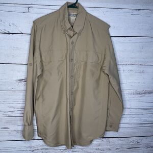 Duluth Trading Mens Small Shirt Solid Tan Vented Roll Tab Sleeves Fishing