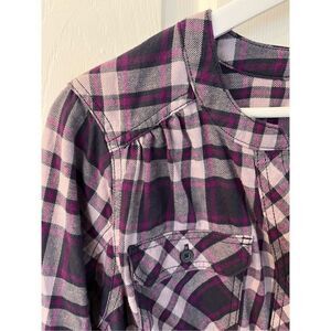 Duluth Trading Purple Flannel Pocketed Button Down Tunic Top sz L EUC